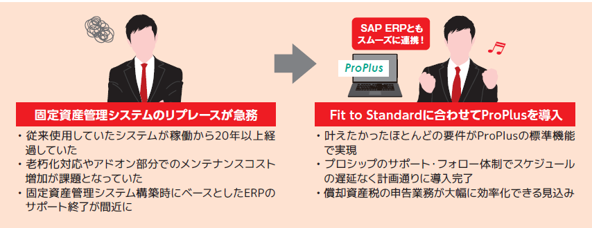 ニュース&トピックス 三菱商事に「ProPlus 固定資産管理ソリューション」を導入 2025/03/17 当社は、三菱商事株式会社(本社:東京都千代田区、代表取締役社長:中西 勝也)に、「ProPlus 固定資産管理ソリューション」を導入したことをお知らせいたします。 【採用の背景と課題】 三菱商事株式会社は、20年以上稼働していた固定資産管理システムの老朽化と維持コストの増加を背景に、システムのリプレースを決断されました。従来のシステムはSAPを基盤に構築された独自仕様のものでしたが、アドオン部分のメンテナンスコストが増加し、システムに利用していた各種製品のサポート終了も迫っていたことから、早急な対応が求められていました。 これまで三菱商事株式会社では自社要件を反映した独自システムの開発が主流でしたが、標準的な機能に業務を合わせるFit to Standardアプローチが主流になりつつある背景を念頭に、できるかぎり標準機能を尊重したパッケージ導入を決断されました。豊富な標準機能が三菱商事株式会社の業務に十分対応できるとご判断いただき、「ProPlus 固定資産管理ソリューション」をご採用いただきました。 【選定理由】 三菱商事株式会社のシステム基盤との適合性や固定資産管理の実績を重視し、下記の点をご評価いただきました。 プロシップは固定資産管理に特化した専業ベンダーであり、法改正対応がスムーズに行える点。 グループ企業ですでにProPlusの導入実績があり、標準機能でほとんどの業務要件を実現できる点。 基幹システムとして採用しているSAPとの連携実績が豊富にあった点。 プロシップのプロジェクトマネージャーに高いリーダーシップと、ITのみならず固定資産と会計・税法の深い知見があった点。 【導入効果】 「ProPlus 固定資産管理ソリューション」の導入効果は下記の通りです。 標準機能に合わせて業務プロセスを見直し、全体の業務の効率化を実現。 これまで固定資産管理システムで計上していなかった資産も一元管理できるようになり、業務が大幅に簡略化。 従来負担の大きかった償却資産税の申告業務においても、ProPlusは電子申告(eLTAX)に対応しているため業務量の削減に大きく貢献する見込み。 【今後の展望】 三菱商事株式会社では、単体決算業務における新リース会計基準の早期適用を検討されています。プロシップの他社に先駆けた新リース会計基準への対応・体制もご評価いただいており、今後もプロシップは三菱商事株式会社の最適なシステム運用をご支援してまいります。 三菱商事株式会社の事例詳細はこちらから 関連リンク 製品紹介サイト:新リース会計基準対応SaaS「ProPlus+」(プロプラスプラス) 特設サイト:よくわかる!新リース会計基準ガイド コラム:経理担当者のための情報発信 日本のリースに関する会計基準 お問い合わせはこちらから