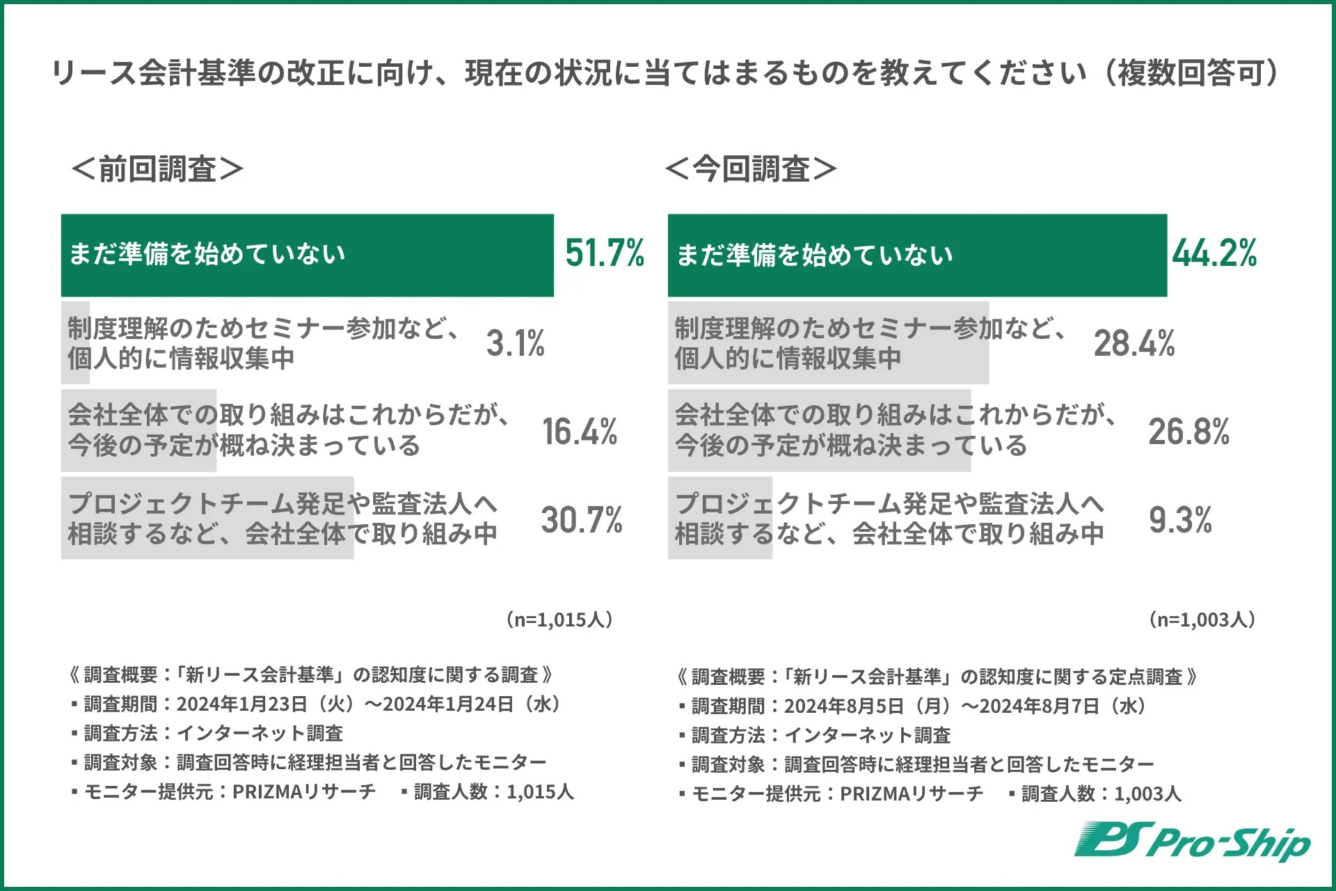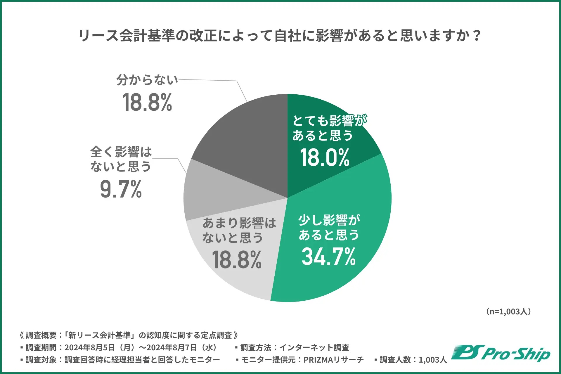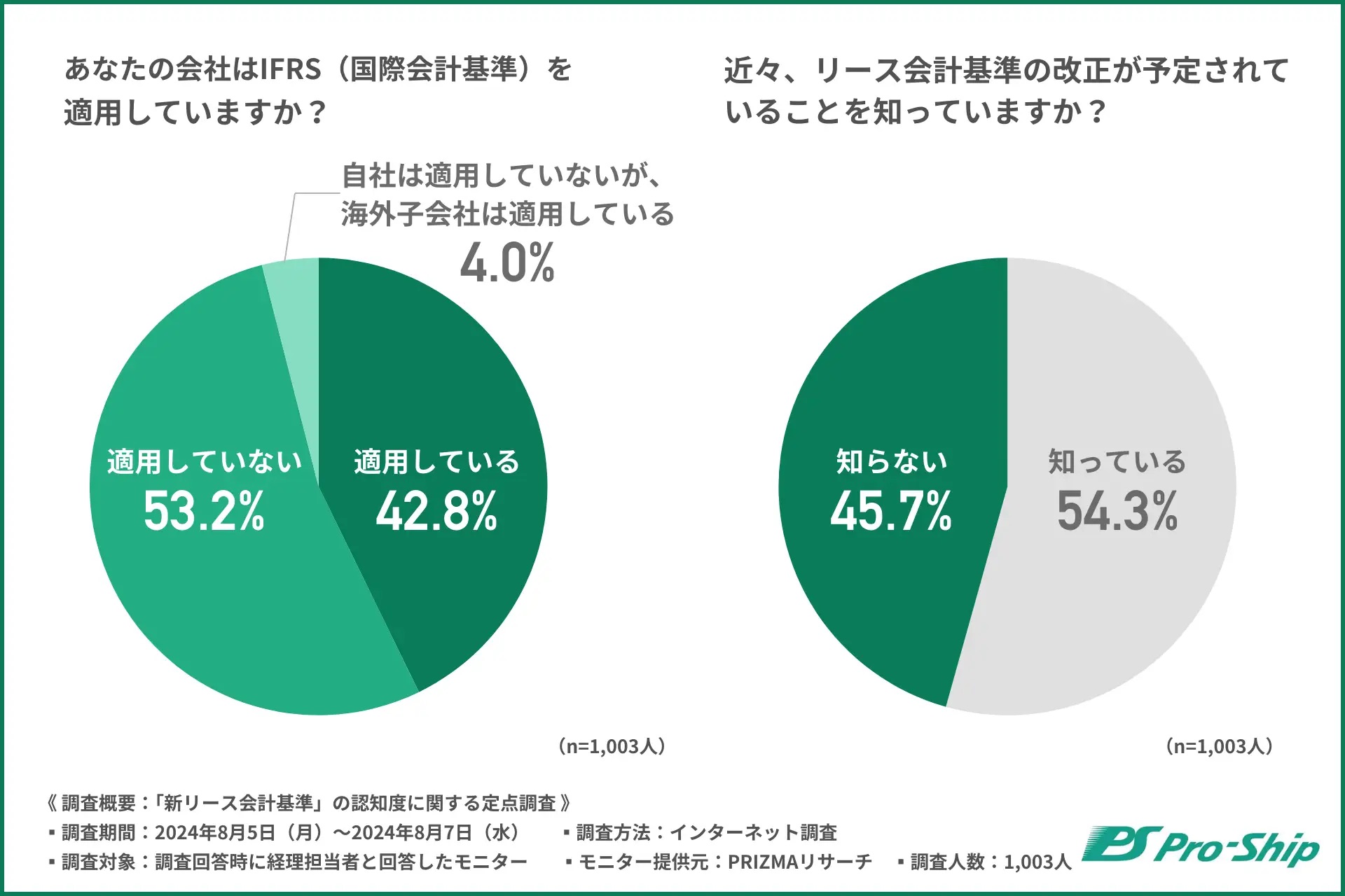 ニュース&トピックス 新リース会計基準に向け、準備を始めた企業は半年前と比べ増加傾向に 2024/08/28 不安の声は「制度内容がよくわからない」が依然として最多 固定資産管理やリース管理をはじめ、資産管理ソリューションをグローバルに展開する株式会社プロシップ(本社所在地:東京都千代田区、代表取締役:鈴木 資史)は、経理担当者を対象に「新リース会計基準」の認知度に関する定点調査を実施しました。 2023年5月にASBJ(企業会計基準委員会)より、新リース会計基準案が発表されました。 その後も審議が続いていますが、2024年8月に行われた審議状況からすると、2024年9月には新リース会計基準の内容が確定する可能性が高く、2027年4月1日以後開始する事業年度の期首から適用される可能性がより現実味を帯びてきています。 半年前に行った「新リース会計基準」の認知度に関する定点調査(https://www.proship.co.jp/news/newlease_20240228/)では、認知度は二極化しており、制度内容をよく理解できていない方も多いということが明らかになりました。 それから、認知度は上がっているのでしょうか。 そこで今回、株式会社プロシップ(https://www.proship.co.jp/)は、経理担当者を対象に「新リース会計基準」の認知度に関する定点調査を行いました。 <調査概要> 調査概要:「新リース会計基準」の認知度に関する定点調査 【調査期間】2024年8月5日(月)~2024年8月7日(水) 【調査方法】リンクアンドパートナーズが提供するPRIZMA(https://www.prizma-link.com/press)によるインターネット調査 【調査人数】1,003人 【調査対象】調査回答時に経理担当者と回答したモニター 【調査元】株式会社プロシップ(https://www.proship.co.jp/) 【モニター提供元】PRIZMAリサーチ 4割以上がリース会計基準の改正予定を知らないと回答 新リース会計基準は、2019年から適用された国際会計基準(IFRS)のリース(IFRS16)と同様の基準で作成されています。 そのため、はじめにご自身が勤める会社でIFRSを適用しているかお聞きしました。 「あなたの会社はIFRS(国際会計基準)を適用していますか?」と質問したところ、『適用していない(53.2%)』と回答した方が最も多く、次いで『適用している(42.8%)』『自社は適用していないが、海外子会社は適用している(4.0%)』という回答結果になりました。 次に「近々、リース会計基準の改正が予定されていることを知っていますか?」と質問したところ、『知っている(54.3%)』『知らない(45.7%)』となりました。 半年前の調査(https://www.proship.co.jp/news/newlease_20240228/)と比較しても『知っている(57.1%)』『知らない(42.9%)』と割合に大差はなく、前回同様に認知度はまだ二極化しているといえそうです。 自社への影響を考える経理担当者は5割以上、準備を始めた企業は半年前よりやや増加傾向 では、新リース会計基準が導入されたときの自社への影響はどのように考えているのでしょうか。 「リース会計基準の改正によって自社に影響があると思いますか?」と質問したところ、『とても影響があると思う(18.0%)』『少し影響があると思う(34.7%)』という回答結果になりました。 次に、「リース会計基準の改正に向け、現在の状況に当てはまるものを教えてください(複数回答可)」と質問したところ、『まだ準備を始めていない(44.2%)』と回答した方が最も多くなりました。 前回調査(https://www.proship.co.jp/news/newlease_20240228/)では、まだ準備を始めていないと答えた方が5割以上いましたが、半年が経ち、4割となりました。 会社全体での取り組みはこれからとなるものの、個人での情報収集を進めるなど、準備を始めた企業がやや増えてきているようです。 準備過程における不安の声とシステムの新規導入・刷新の予定 では、準備過程において何か不安を感じていることはあるのでしょうか? 「準備過程において不安に感じていることはありますか?(複数回答可)」と質問したところ、『制度内容がよくわからない(46.8%)』と回答した方が最も多く、次いで『準備の手順がわからない(34.0%)』『準備を進めるリソースが無い(24.1%)』となりました。 前回調査(https://www.proship.co.jp/news/newlease_20240228/)でも、制度内容がよくわからないと答えた方が最多で4割以上と、半年が経過しても詳しい制度内容を把握できていない状況は変わらないようです。 次に「公開草案の公表を受け、リース管理システムの新規導入・刷新を行う予定はありますか?」と質問したところ、『ある(24.7%)』『ない(32.1%)』『検討中(21.1%)』『不明(22.1%)』となりました。 5割を超える企業にシステムの新規導入・刷新の可能性があることが明らかになり、前回調査(https://www.proship.co.jp/news/newlease_20240228/)に比べて割合が増えています。 まとめ:自社への影響や導入の必要性など早めに確認を 今回の定点調査では、半年前に行った調査(https://www.proship.co.jp/news/newlease_20240228/)と回答者が異なるため、認知度にやや差はあるものの、4割以上の方がまだ知らないことから、認知度の二極化は続いていることがわかりました。 そして、新リ