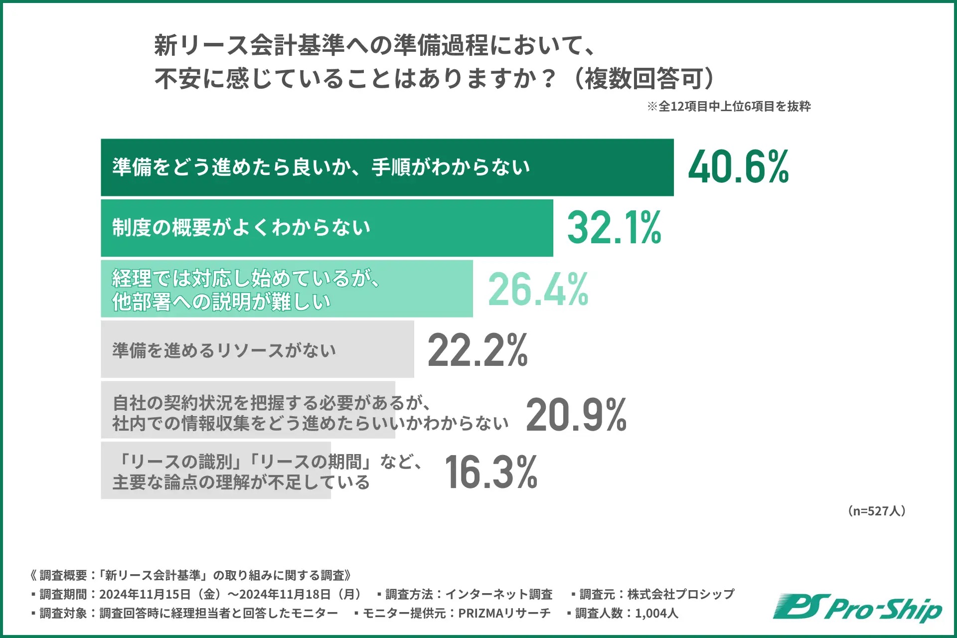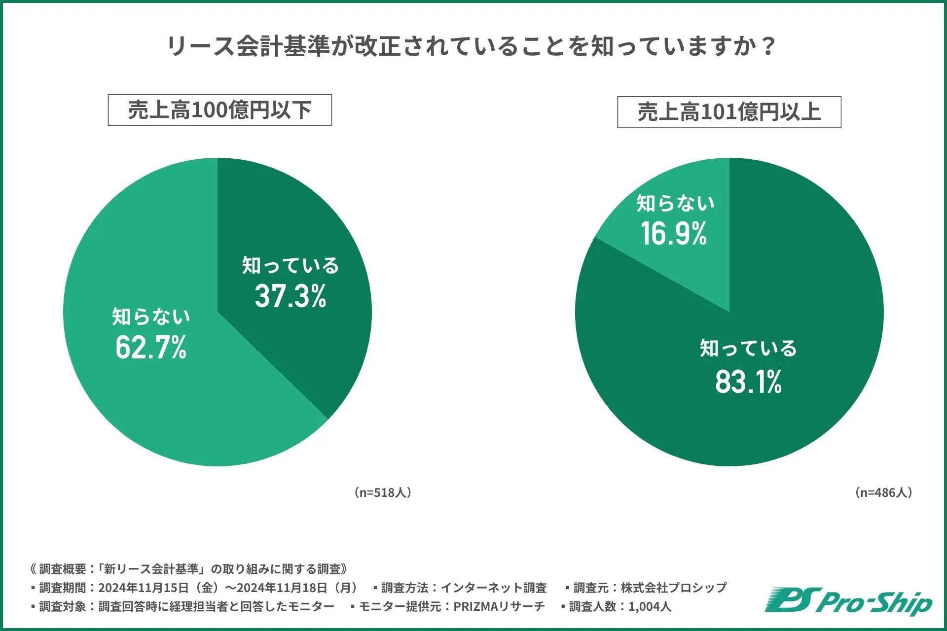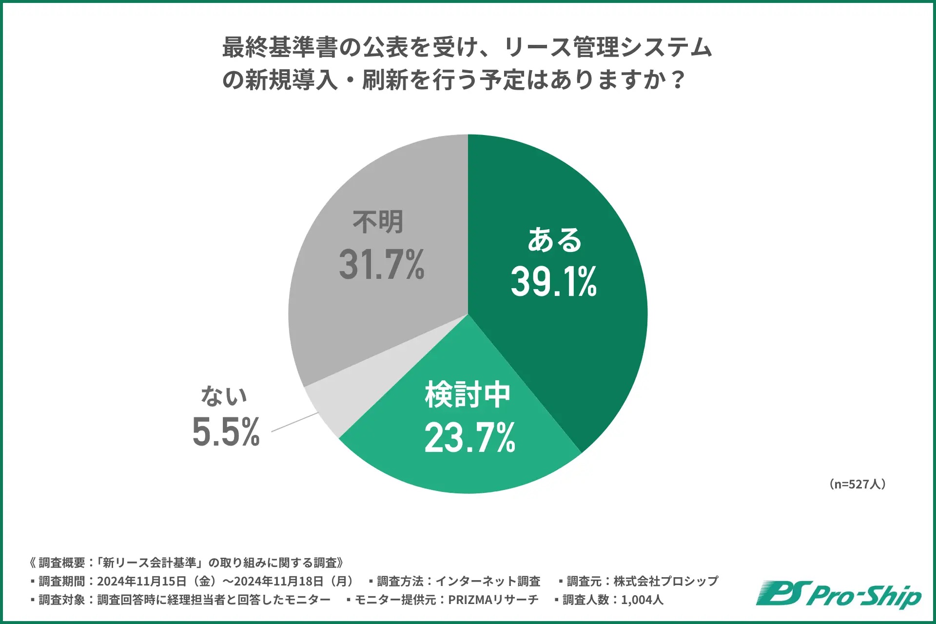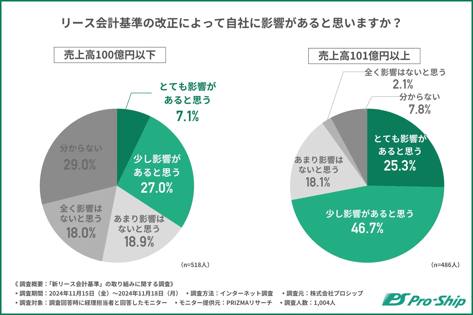 ニュース&トピックス 新リース会計基準の適用に向け、影響がある企業の9割が準備を開始 2024/12/18 準備過程での不安は『準備をどう進めたらよいか、手順がわからない』が最多 当社は、経理担当者を対象に、「新リース会計基準」の取り組みに関する調査を実施しました。 2024年9月13日にASBJ(企業会計基準委員会)より、新リース会計基準が公表されました。 2027年4月以降に開始される事業年度から、強制適用となります。 9月の最終基準書公表後、各企業の準備はどの程度進んでいるのでしょうか。 そこで今回、株式会社プロシップ(https://www.proship.co.jp/)は、経理担当者を対象に、「新リース会計基準」の取り組みに関する調査を行いました。 <調査概要> 調査概要:「新リース会計基準」の取り組みに関する調査 【調査期間】2024年11月15日(金)~2024年11月18日(月) 【調査方法】PRIZMA(https://www.prizma-link.com/press)によるインターネット調査 【調査人数】1,004人 【調査対象】調査回答時に経理担当者と回答したモニター 【調査元】株式会社プロシップ(https://www.proship.co.jp/) 【モニター提供元】PRIZMAリサーチ 売上高ごとの認知度と自社への影響 はじめに、「リース会計基準が改正されていることを知っていますか?」と質問したところ、以下の回答結果となりました。 売上高が100億円を境に、新リース会計基準の認知度に大きく差が出る結果となりました。 売上高100億円以下の企業には、中小企業など、新リース会計基準が適用されない会社も多く含まれると予想されることから、このような認知度の違いが出ていると考えられます。 次に、新リース会計基準による影響を聞いてみたところ、下記の分布となりました。 自社への影響も売上高により違いがでており、売上高101億円以上の企業においては影響があると思うと回答した方が7割にも上りました。 改正に向けての準備状況は? では、「影響がある」と回答した企業では、どの程度準備が進んでいるのでしょうか。 現在の準備状況において以下の回答結果となりました。 自社に影響があると回答した企業のうち、9割近くがすでに何らかの準備を始めていることがわかりました。 リース管理システムの新規導入・刷新予定について では、最終基準書の公表を受け、リース管理システムの新規導入・刷新を行う予定はあるのでしょうか。 回答結果は下記の分布となりました。 自社に影響があると回答した企業の6割超が、新システムの導入や刷新を予定している、または検討中であることがわかりました。 では新リース会計基準への準備過程において、不安に感じていることはあるのでしょうか。 アンケートでは以下のような不安の声があがりました。 準備の進め方や制度の内容がわからない、他部署への説明方法が難しいなど、準備を進めていく中での課題が浮き彫りになりました。 まとめ:自社への影響がある企業では約9割が準備段階に!一方で準備の手順がわからないなど、準備過程での不安の声も多数 今回の調査で、「新リース会計基準」の認知度や対応状況が明らかになりました。 売上高が100億円以下の企業では、新リース会計基準が適用されない会社も多く含まれると予想されることから認知度は低く、自社への影響があると回答した方は3割程度にとどまりました。 一方で、売上高が101臆円以上の企業では新リース会計基準の認知度は高く、7割を超える企業が自社への影響があると回答しました。 そして、自社への影響があると回答した企業の約9割がすでに何らかの準備に入っていることが明らかになりました。 また、リース管理システムの新規導入・刷新の予定がある、または検討中と回答した企業も6割を超え、最終基準書の公表を受け、自社への影響がある企業では準備が加速しているようです。 準備過程においては、準備の進め方や制度内容がわからないといった基本的な部分や、経営層や他部署への説明方法、自社の契約情報を把握するための情報収集方法、主要論点の理解不足などを不安視する声が多くあがりました。 今回の日本の新リース会計基準は、IFRS16とほぼ同じ内容に改正されるため、IFRS16適用時の事例を参考にできます。 2019年度に適用されたIFRS16の適用事例をもとに、新リース会計基準を2027年4月より適用する場合、2024年度は現状把握や影響分析、2025年度は会計方針検討・決定、2026年度は業務設計やシステム導入に充てることが理想であるといえるでしょう。 (参考URL:https://www.proship.co.jp/nab/schedule/) 新リース会計基準は財務指標や業務に与えるインパクトが大きく、現行の業務プロセスの変更や海外を含めた子会社のルール整備が必要になることが、IFRS16の事例からも明らかです。 システムの新規導入やバージョンアップをする場合、そのシステム会社の対応可能時期を加味する必要もあります。 しかし、2027年度の適用に合わせてシステム会社の需要が高まることで、対応が遅れてしまったり、対応できなくなる可能性もあると予想されています。 自